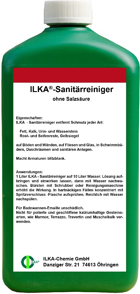 ILKA Sanitärreiniger -to środek do czyszczenia sanitariatów usuwa wszelkiego rodzaju zanieczyszczenia: Tłuszcz, wapno, mocz i kamień wodny, rdza i pozostałości mydła, czyści silikonowe uszczelnienia, płytki na podłogach i ścianach, szkło, w basenach, prysznicach i sanitariatach.